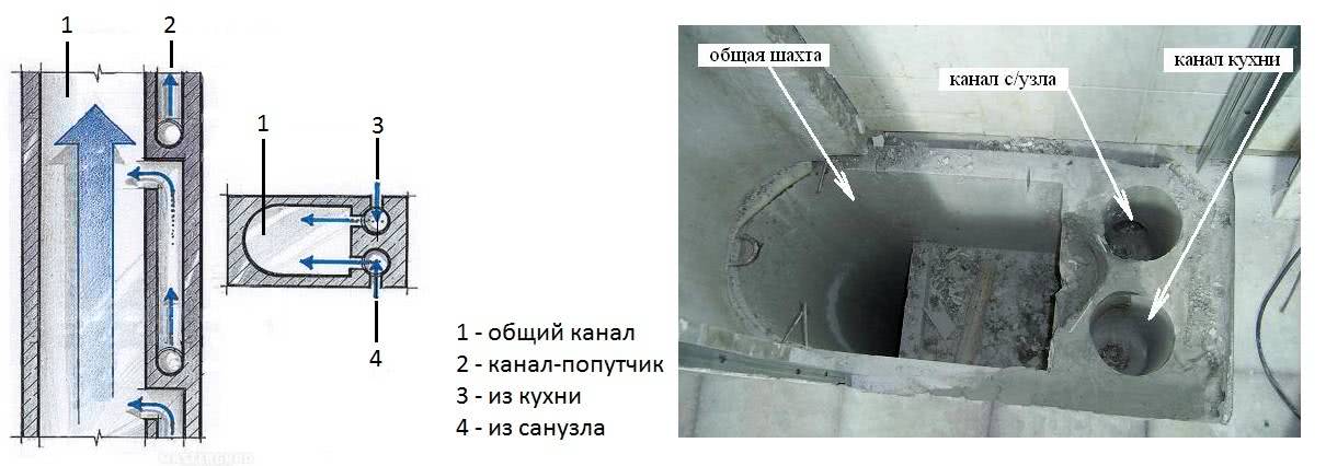 Другой вариант вентсистемы – межэтажные каналы. Каждый канал рассчитан на квартиры смежных этажей. Каналы пропускают через себя воздух с квартир и направляют его в общую. вентшахту с выходом на крышу. Начиная с конца 70-х годов, в домах такие каналы дополнительно оснащаются заглушками, чтобы более плотный воздух с одного канала не поступил в другой. Но в хрущевках более ранней постройки они отсутствуют, что сопровождается попаданием тяжелого воздуха с насыщенными газами в соседнюю квартиру.