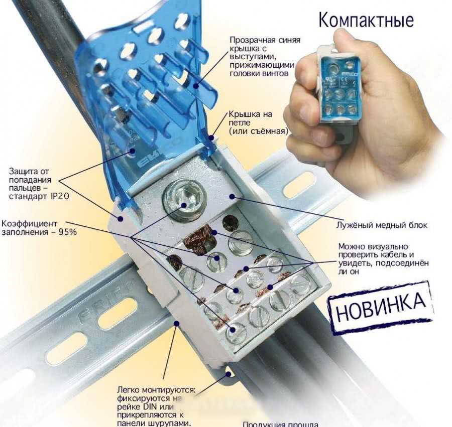 Монтаж простейшей клеммы к щитку выполняют закрытым и открытым способом. Первый вариант предупреждает злонамеренную порчу шины мощных или важных устройств, второй метод применим при отсутствии риска повреждения аппарата. Нулевые колодки с винтовыми соединениями фиксируют к распределительному щитку на DIN рейке, дополнительной изоляции для заземления не предусмотрено.