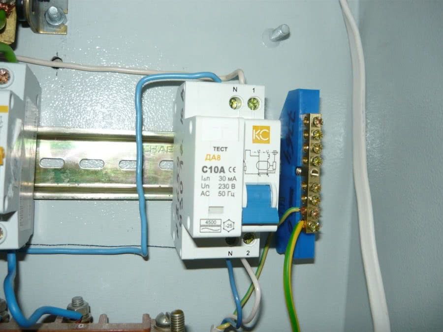 - Подключить проводник, идущий из устройства защитного отключения в один из зажимных болтов шины.
