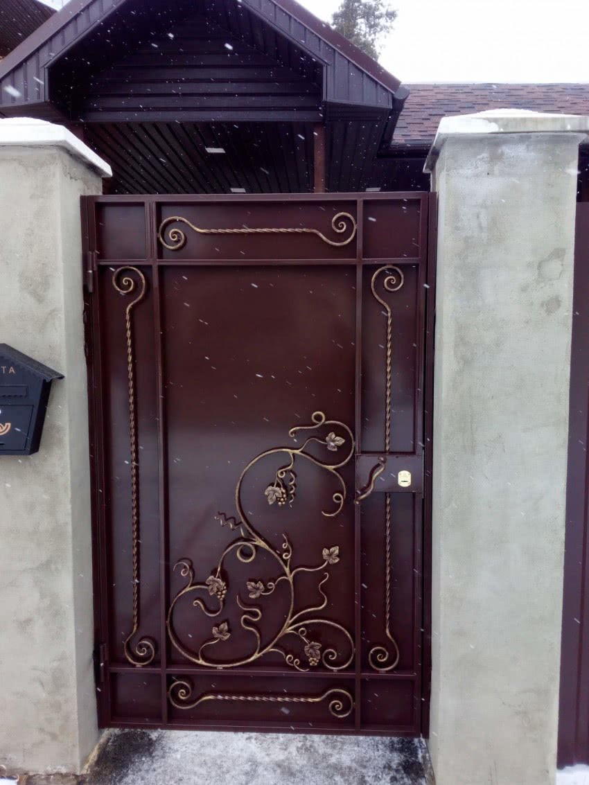 Прекрасно сочетаются элементы ковки с полотном из профнастила. Декорировать такое полотно можно, расположив кованые элементы согласно чертежу, и с помощью сварки закрепить их на полотне калитки.
