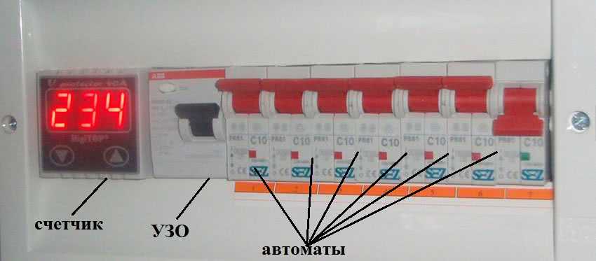 Есть несколько вариантов компоновки щитка — это касается места установки вводного автомата и счетчика. В частном доме могут счетчик поставить на столбе, а автомат — на фасаде дома, почти под крышей.