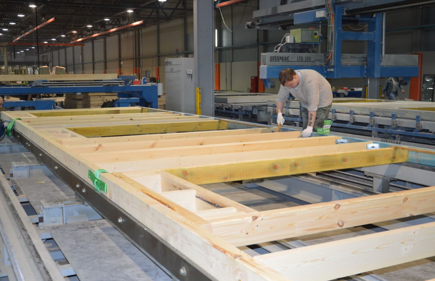 Технология строительства щитовых деревянных домов предполагает вертикальное расположение щитов с последующим соединением гвоздями. При устройстве стыков между щитами необходимо обеспечить достаточную плотность и не продуваемость стыка. Стык необходимо перекрывать непрерывными слоями воздухо- и пароизоляции. В стык закладывают минеральный войлок слоем толщиной 20 мм, приклеивая его холодной битумной мастикой. Затем с помощью рычажного приспособления производят обжатие стыка. В щитовых домах перекрытия устаревают щитовые или балочные.
