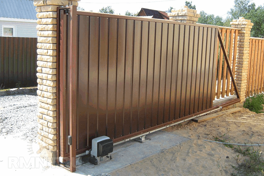 Откатные ворота наиболее распространены на территориях, не подверженных обильным снегопадам и сильному снижению температуры воздуха в зимнее время. Их конструкция выполняется таким образом, что створка при открытии и закрытии движется по швеллеру, вмонтированному в бетонный фундамент.