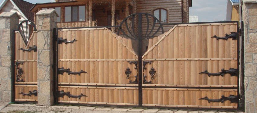 Кроме того, необходимо заранее подготовить комплектующие, материалы и инструменты для работы. Самыми оптимальными полотнами для этого считаются профили из металла и листы профнастила, однако, некоторые владельцы приусадебных участков используют в качестве обшивки конструкции деревянный брус или кованые чугунные элементы.
