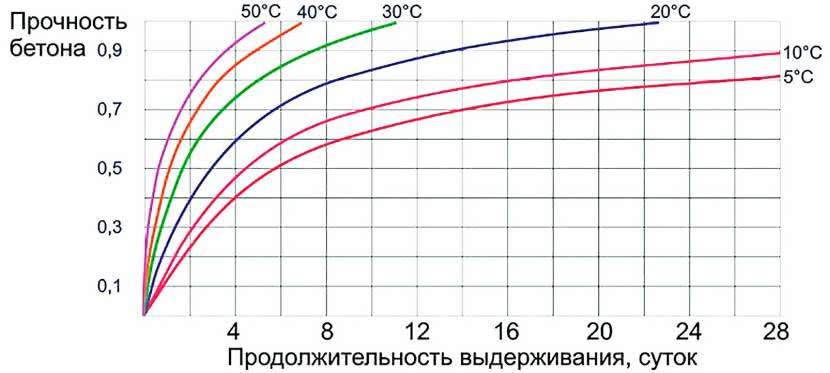 Расчётная прочность бетонного состава наступает после 28 суток твердения с момента заливки смеси в конструкцию.