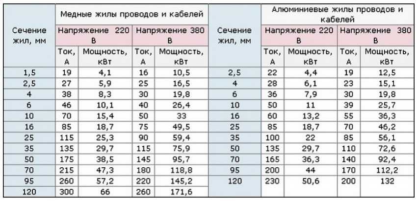 Таблица соотношения сечения кабеля к соответствующей нагрузке.