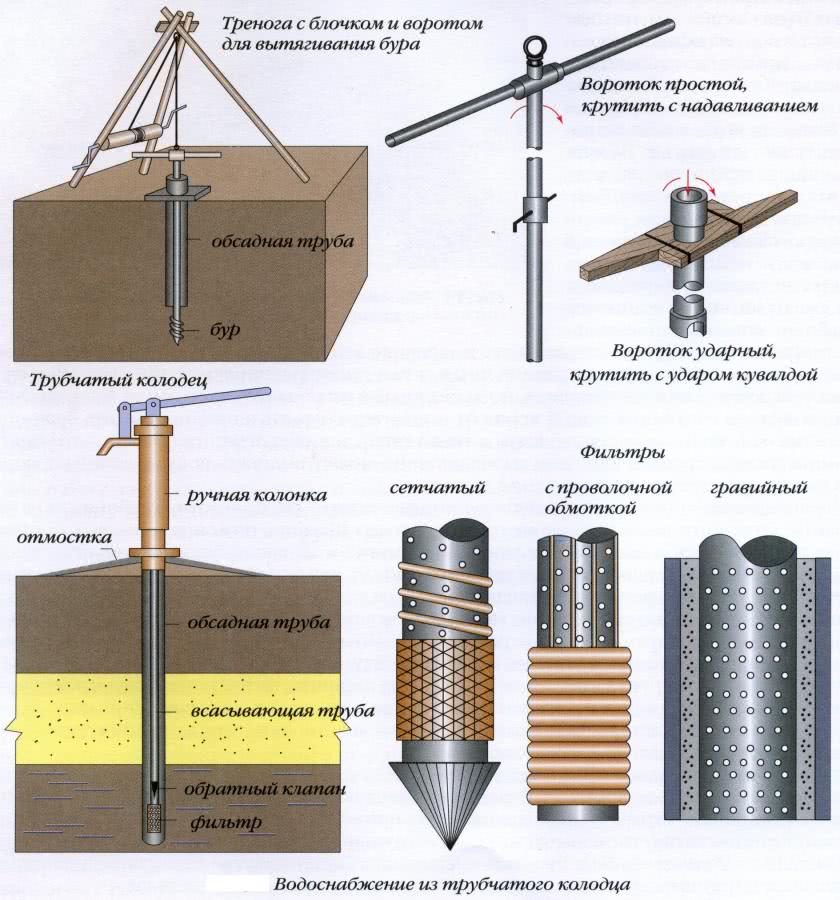 | Абиссинский колодец | Абиссинский колодец или трубчатый, имеет глубину порядка 8-12 метров. Его отличием является, что вода в нем гораздо чище. Здесь верховодка не попадает, так же не может проникнуть и грязь с пылью; |