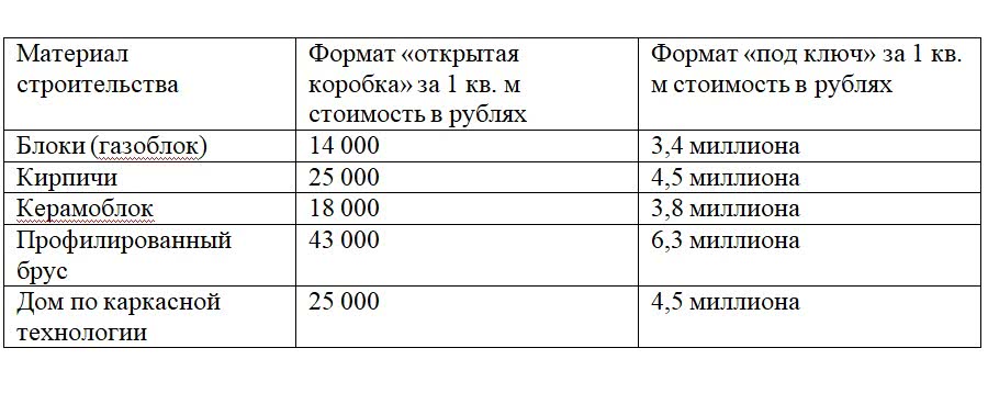 Чтобы сравнить стоимость дома площадью в 100 кв. м в Москве, МО, оценку проводят в двух форматах: дом без отделки и крыши, то есть «открытая коробка» и дом «под ключ»: