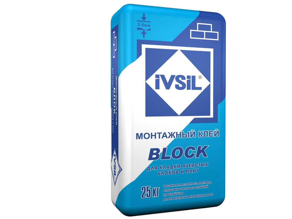 «Ивсил Блок» – монтажный клей широкого спектра применения, в том числе подходит для газобетонных блоков. Толщина шва – от 2 до 5 мм. Жизнеспособность раствора до 2,5 часов. Коррекция блока – до 15 мин. Заявленный расход – около 25 кг на кубометр кладки. Упаковка – мешки по 25 кг. |
