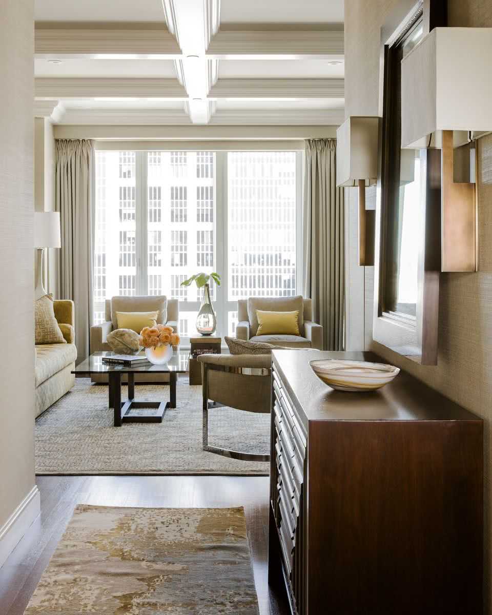 - в выборе мебели для жилых комнат квартиры стоит отдавать предпочтение изделиям с каркасом из древесины и хрома, дополняя обстановку столиками из усиленного стекла, окрашенного в натуральный цвет (оно наполняет любой интерьер легкостью и воздухом независимо от размера).