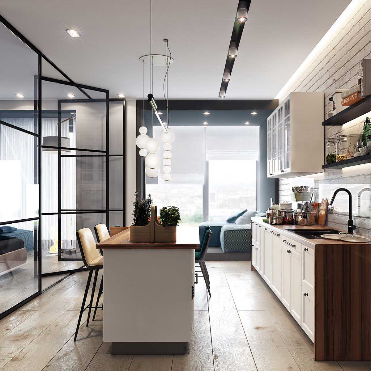 Использовать большие двуспальные кровати в этом случае не стоит, так как они отнимают много места. В санузле может поместиться стиральная машина, а в кухонной зоне посудомоечная машина и холодильник. Всего этого будет достаточно для того, чтобы функциональность помещения стала максимальной.