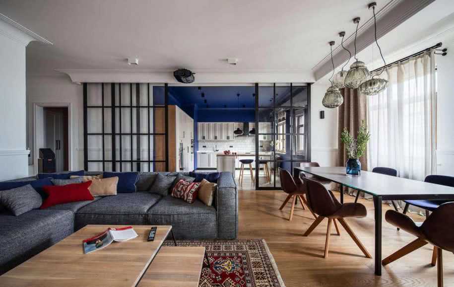 Интересная задумка оформления просторной гостной с обилием синего цвета