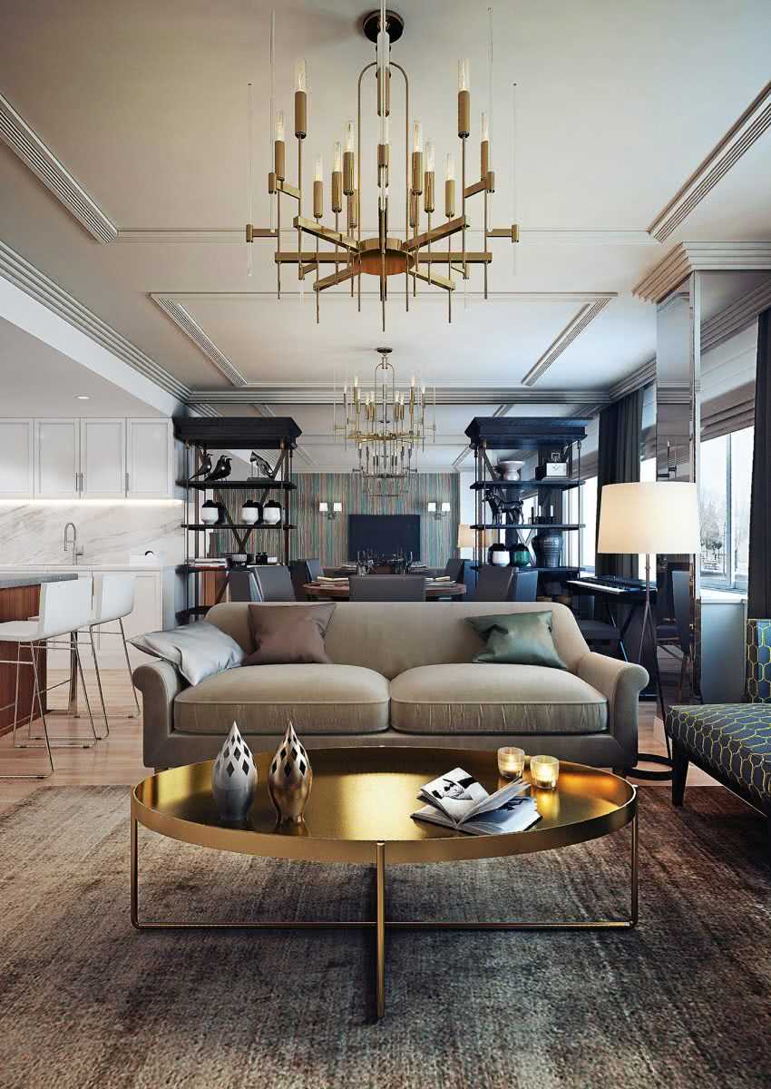 Золотистые нотки придают интерьеру утонченную гламурность, а ахроматическое дополнение позволяет уравновесить все составляющие окружающего пространства, сделав его сдержанным и элегантным.