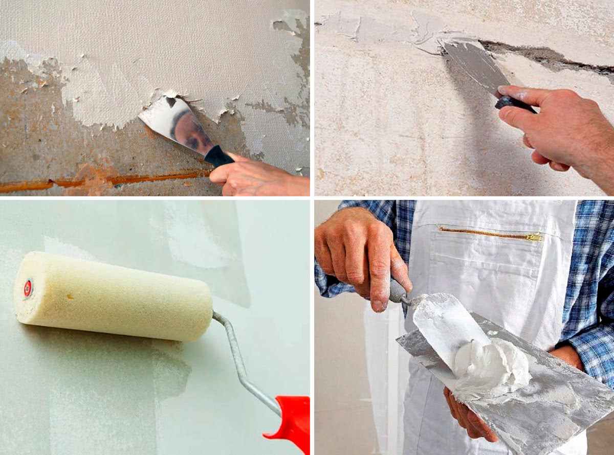 Когда выбрали материалы для работы, готовится основание. Сначала проводится очистка от пыли, остатков декоративного покрытия, инородных частиц. Старые обои будут лучше сниматься, если их предварительно намочить с помощью валика, а масляная краска хорошо отходит при нагревании феном.