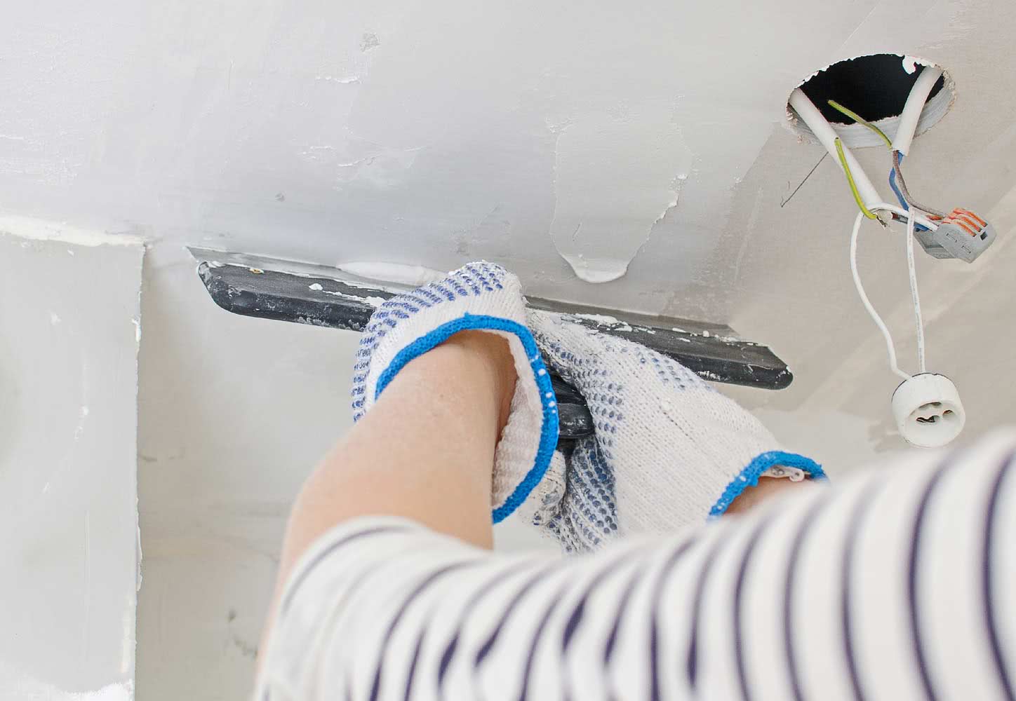 В предварительной подготовке нуждаются и потолки в новостройках, и те, которые уже не раз ремонтировались. Поверхность потолка нужно очистить от пыли, убрать старое покрытие или его остатки, хорошо протереть влажной ветошью. Старая штукатурка и побелка снимаются легко, если их немного намочить и дать пропитаться влагой. С помощью шпателя отсыревшее покрытие снимается без остатка.