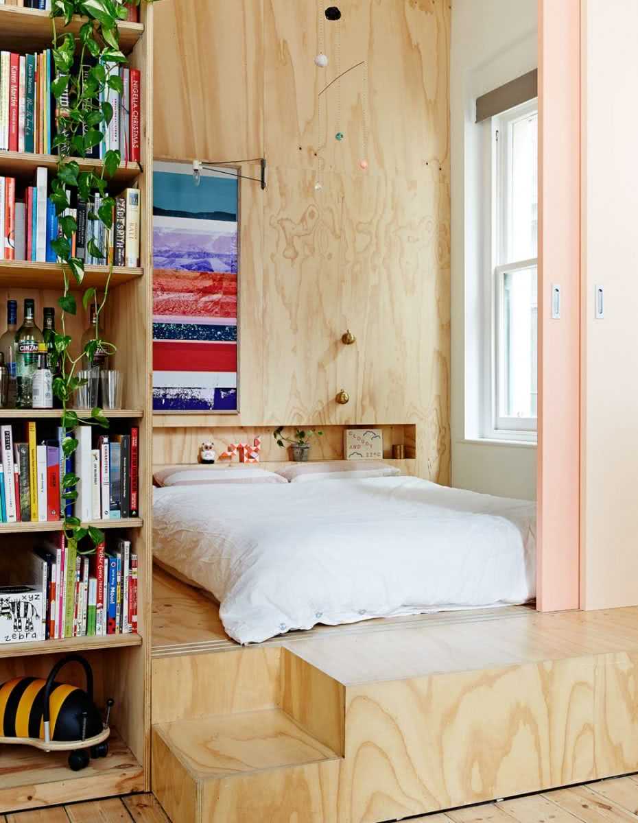 Вместо того, чтобы заполнить нишу гардеробной или дополнительными полками, вы можете встроить туда кровать. Такая территория не будет главенствовать в гостиной. Если вы хотите спрятать место для сна еще больше, то можете установить занавески в углубление. Гости не поймут, что находится за ширмой: шкаф, спальня или офис. Стоит установить платформу с отсеками для хранения в углублении. Благодаря этому вы получите дополнительные ящики. Тогда кровать будет на несколько сантиметров выше, чем остальная мебель, и это сделает спальню более освещенной.