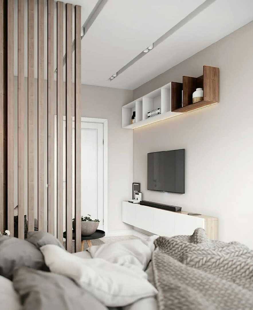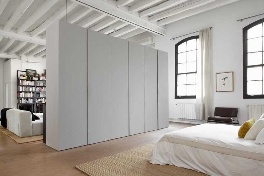 Книжный шкаф или стеллаж будет закрывать кровать, четко разделяя две зоны в одной комнате. Это отличное решение для людей, которые любят читать. Таким образом, полки с книгами будут в спальне, а стена шкафа в гостиной. Если гостиная также является офисом, то шкаф можно развернуть. А на стену мебели можно легко монтировать экран телевизора.