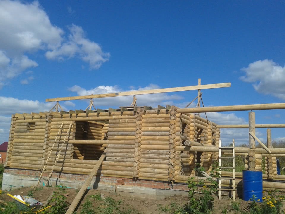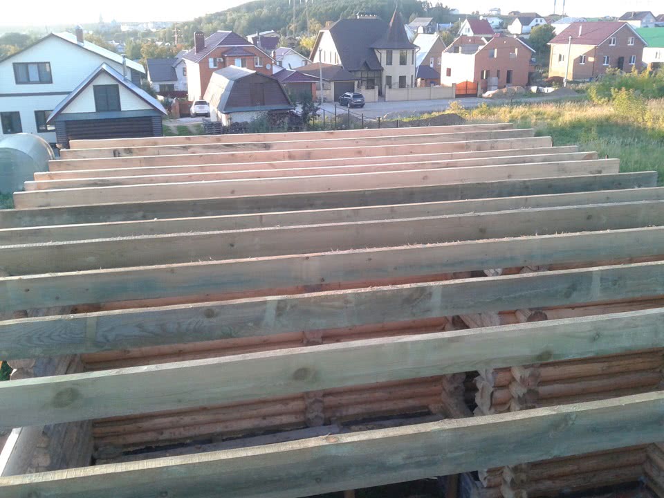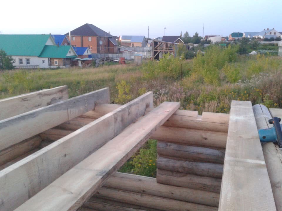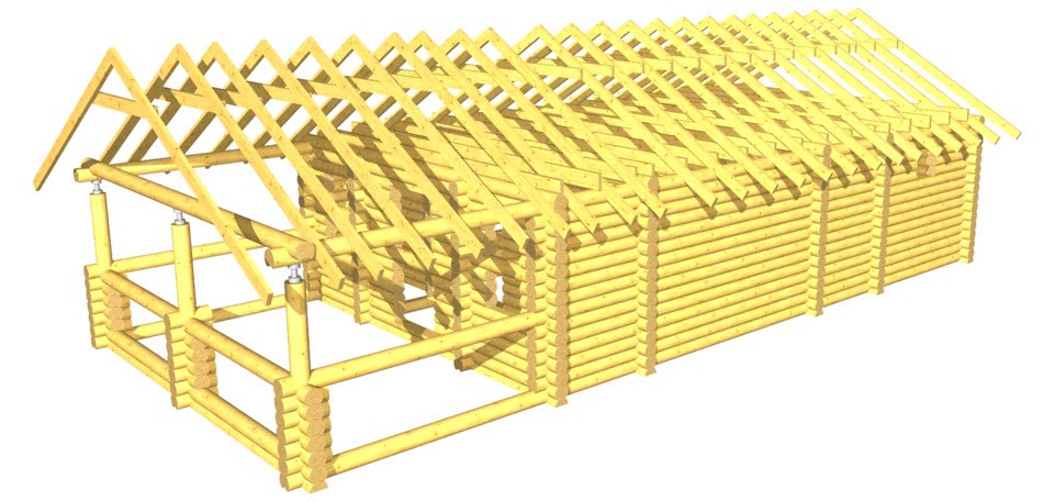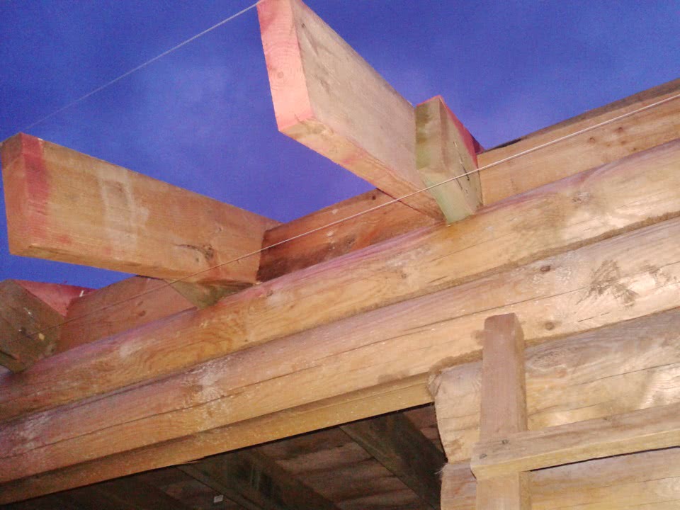 - При достижении требуемой высоты сруба монтируются балки для потолка и стропильная система.
