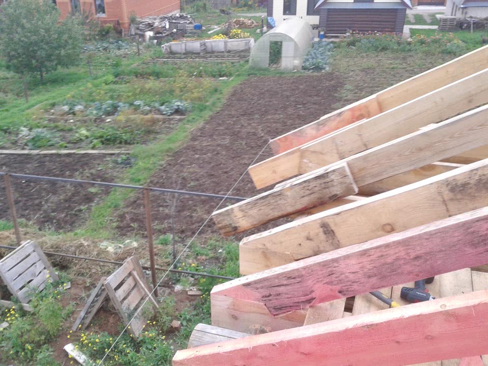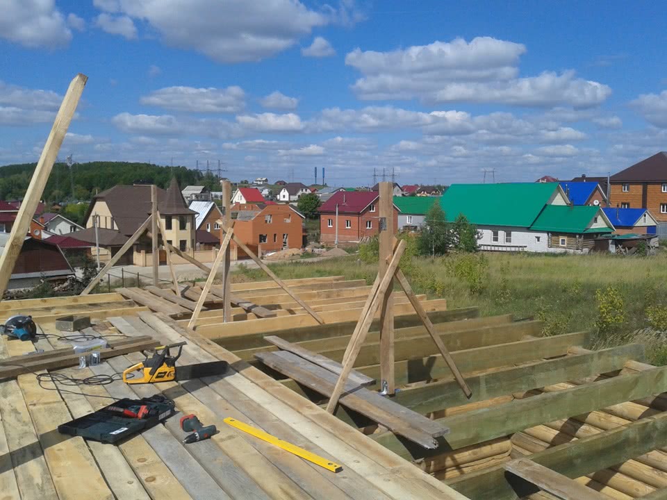 Стройка продолжается…Надо выставить стропильные фермы над верандой, установить гироизоляционную пленку и набив обрешетку подойти к монтажу металлочерепицы.