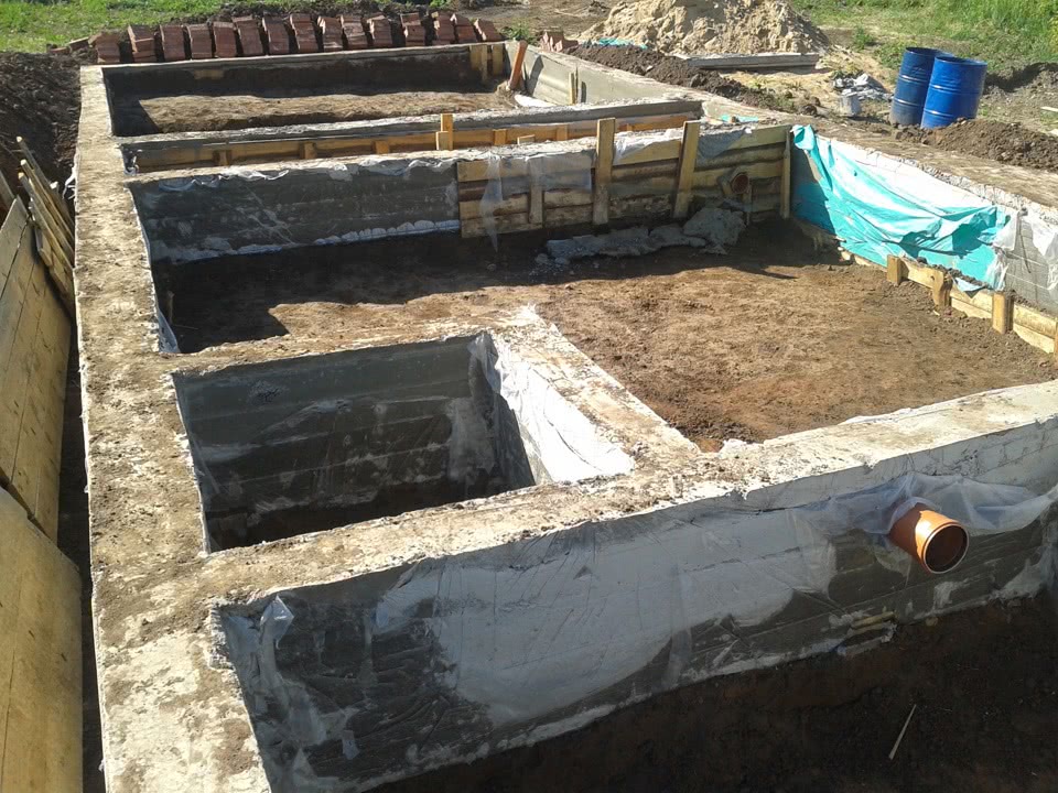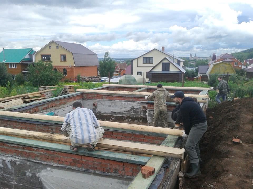Начало было как у всех, нанят трактор, прокапавший траншею, потом «чудо мастера», которые собрали опалубку и связавшие арматуру. Опалубка у них развалилась при заливке бетона, и вместо стены в 250мм, я получил все 700.Бетона не хватило вывести в горизонт. дальше в ручную доливали. Итог горизонта нет! Один угол 0, другой -13,5, третий -9, четвертый -6.