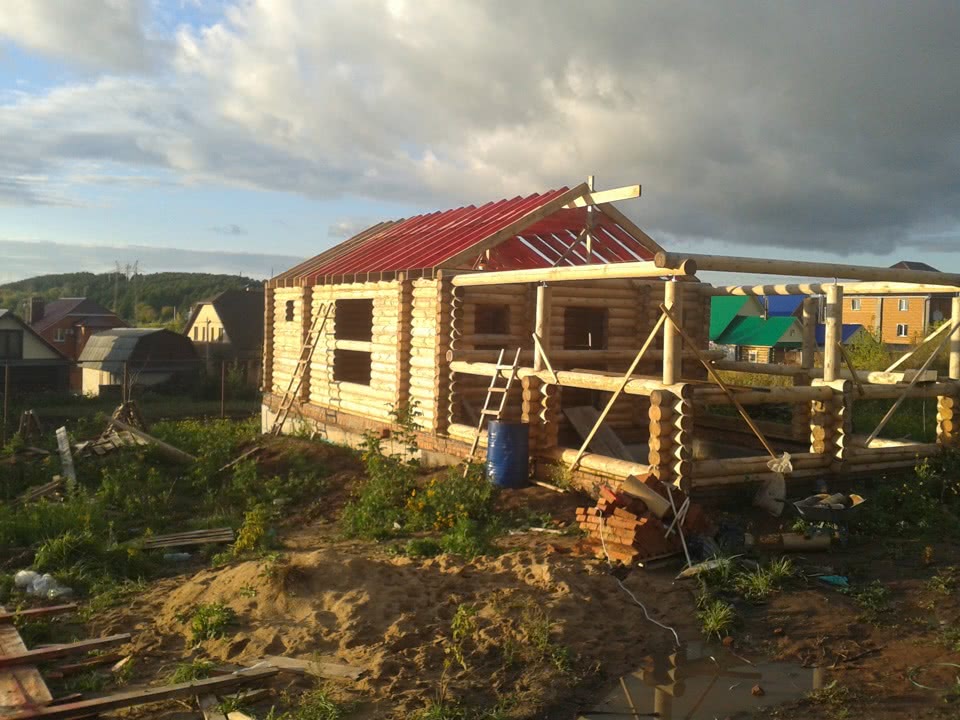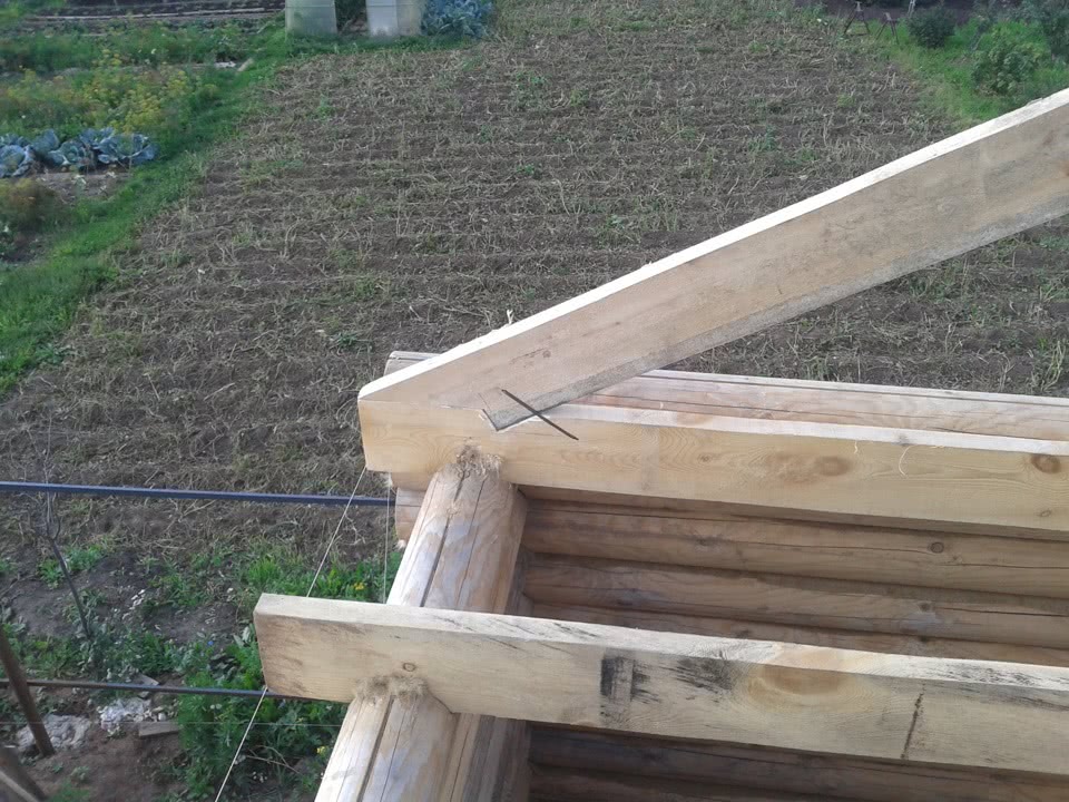 Шаг 6. Подняв стены на нужную высоту, уложите поверх них потолочные балки и стропила. Если использовалась влажная древесина, то вместо стропил уложите листы шифера и дождитесь усадки конструкции. Обычно для этого достаточно один раз перезимовать, но в идеале усадка должна длиться год-полтора.