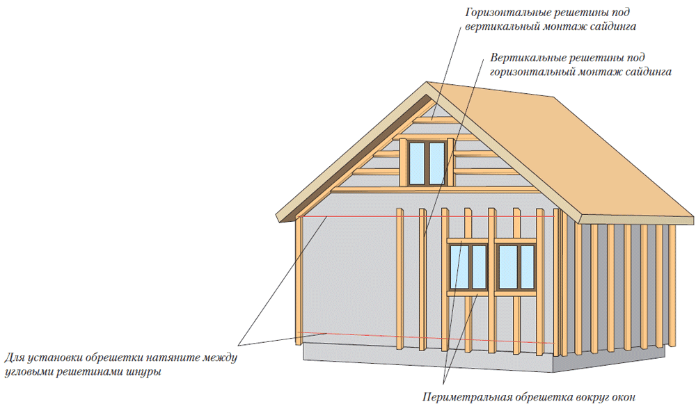 Также на этом этапе определяем направление обрешетки: если сайдинг будет крепиться горизонтально, то производится вертикальная установка обрешетки под сайдинг, и наоборот.