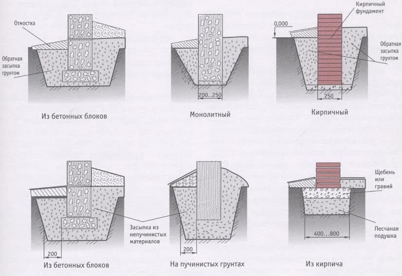 Сооружение из кирпича или бетонных блоков строится по одному принципу. В обоих случаях колонны могут покоится непосредственно на грунте (для скальных или сильно каменистых пород), на песчано-гравийной подушке или на предварительно выполненной монолитной бетонной опоре.