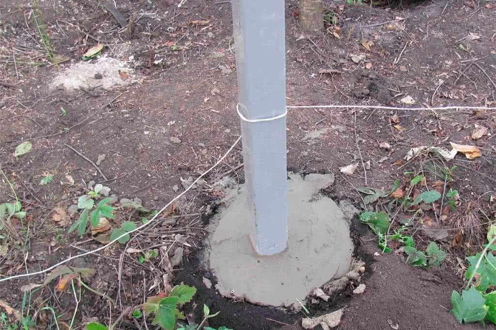 Для пучинистых грунтов, к примеру, столб бетонируют на глубину 1,5 м. Надземная часть – 2 м, получаем 3,5-метровые отрезки. Для участка в 6 соток потребуется 175 м круглой трубы или квадратной профтрубы с сечением не менее 40х40 мм. Перед началом монтажа столбов места их установки размечают, используя колышки и натянутую по ним леску. Шаг установки столбов одинаков повсюду. Для монтажа труб сделайте следующее: