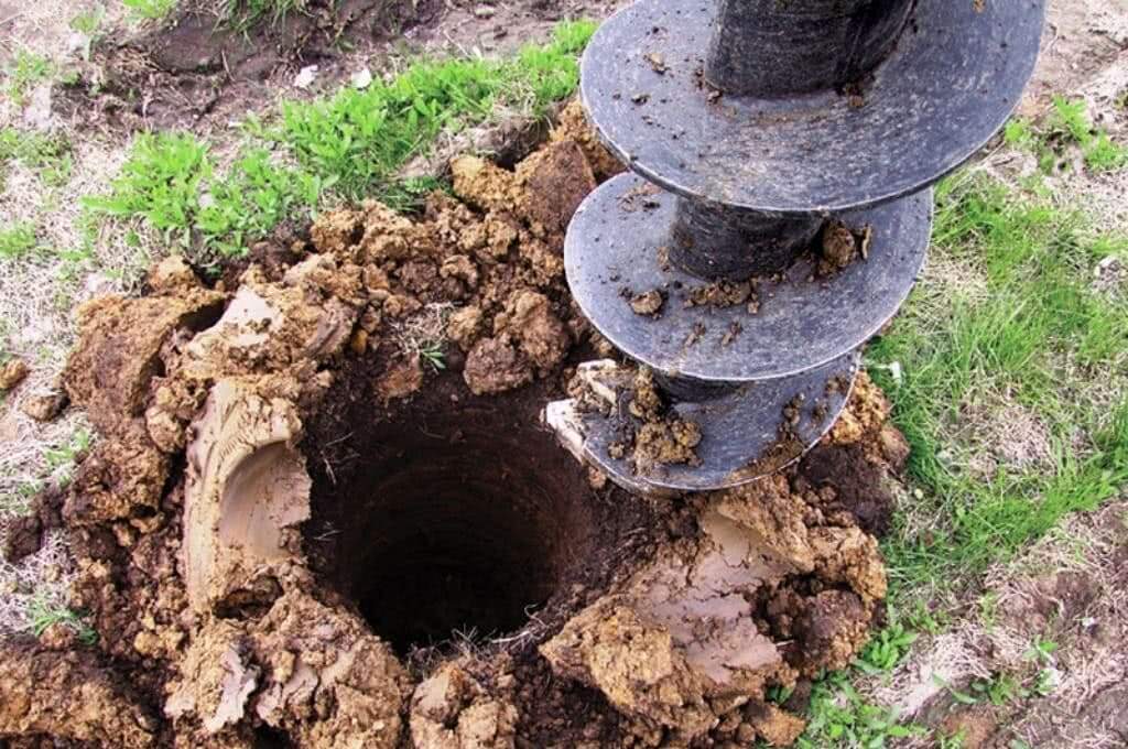 - С помощью электрического привода или мотоблока – и садового бура без горизонтальной ручки – выкопайте лунки для столбов на нужную глубину.
