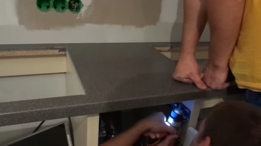 Для упрощения процесса рекомендуется выполнять этот этап вдвоем. Помощник должен с усилием давить на столешницу. Это нужно для того, чтобы было легче прикрутить ее шурупами.