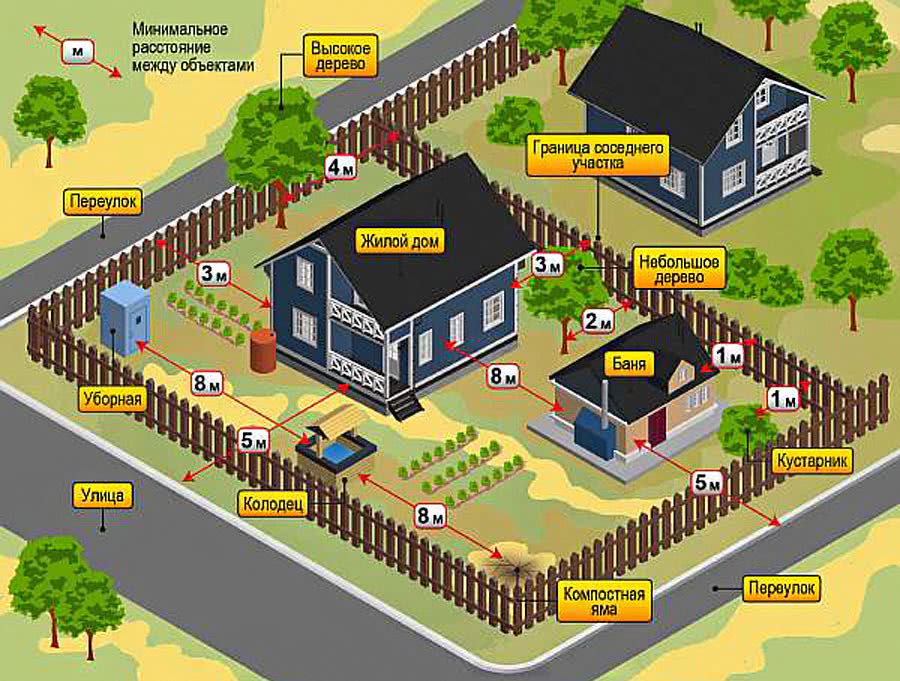 - Когда определились с размером и ее размещением, соблюдайте правила расстояния от границ участка (2,5м), чтобы у соседей не было дискомфорта и претензий в дальнейшем.