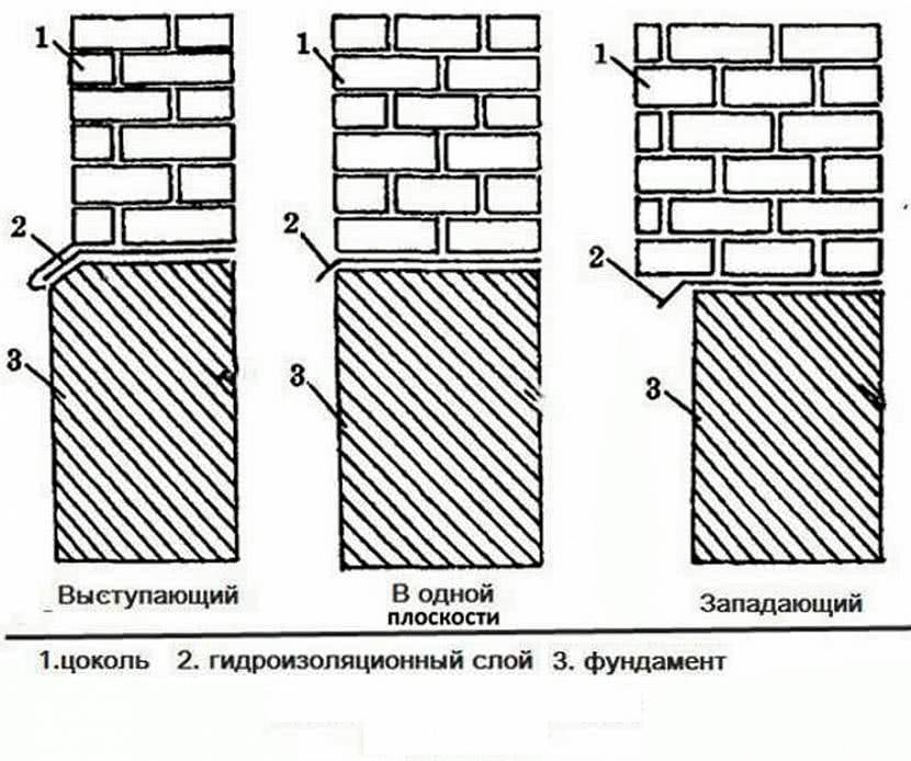 По конструктивному исполнению цоколь относительно основного фасада может быть выступающим, западающим или в одной плоскости. Первый считается самым надёжным ввиду массивной толщины, второй лучше защищает подпольное пространство от талой и дождевой воды при дополнительном проведении стоковой системы в отмостке. А третье решение упрощает проведение отделочных работ.