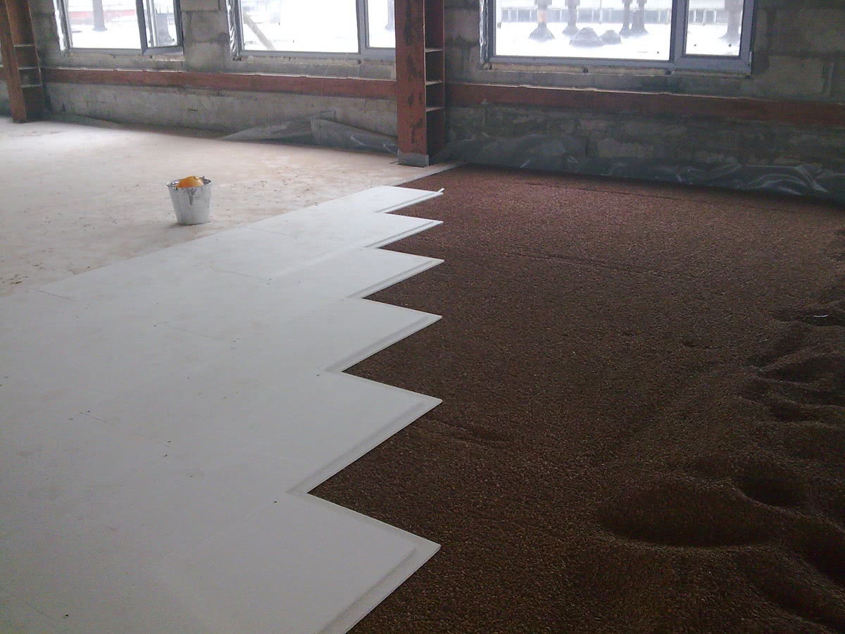 Материал необходимо насыпать слоем 3–4 см для обычных перекрытий и 10 см для первого этажа. Начинать нужно с дальнего угла комнаты. Засыпку наносят порционно, чтобы потом не топтаться по подготовленному слою. После этого нужно прижать правило к маякам и разровнять. Далее рекомендуется утрамбовать материал штукатурной теркой. Излишки можно набрасывать дальше, а при образовании ям нужно их засыпать и снова разровнять. Если планируется сначала заполнить всю площадь, а потом крепить листы, то необходимо просто положить по всей комнате фанеру без фиксации, чтобы обустроить площадки, на которых можно стоять. Или же закрывать засыпку сразу после выравнивания.