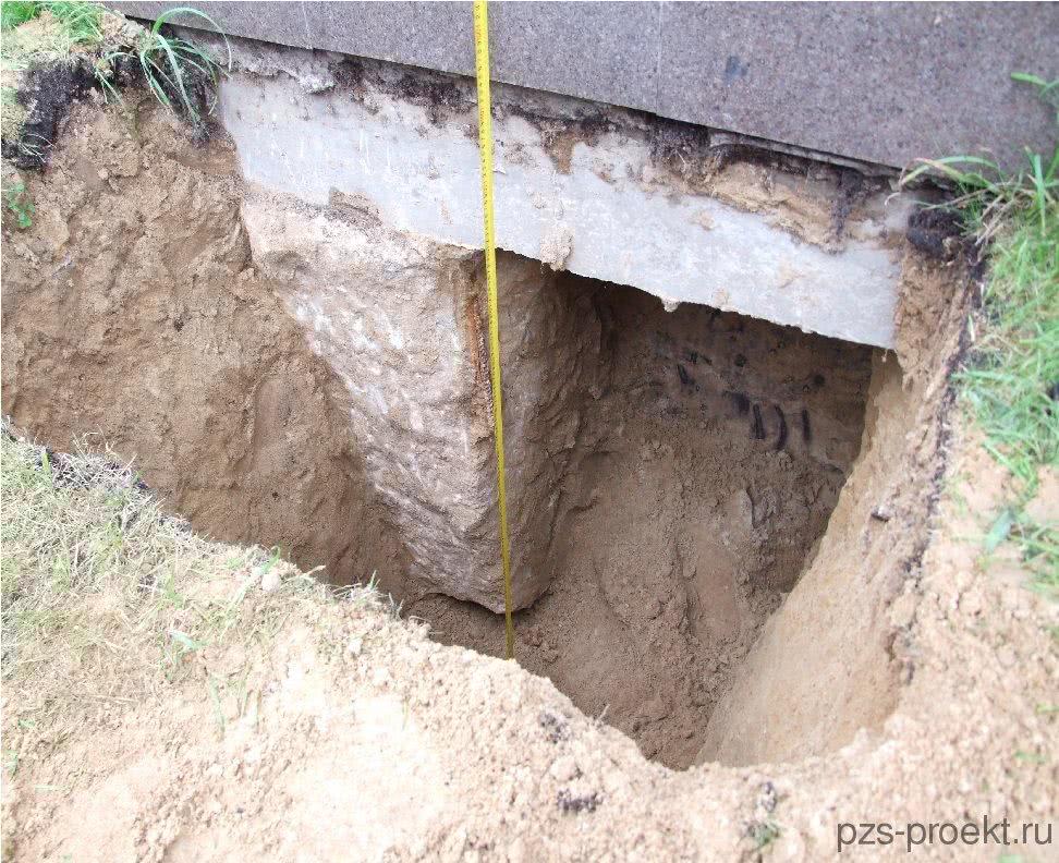 - Для обследования фундамента необходим шурф, по глубине равный высоте подземной части фундамента. Следует вырыть яму до самого основания, до той точки, где бетон опирается в грунт.
