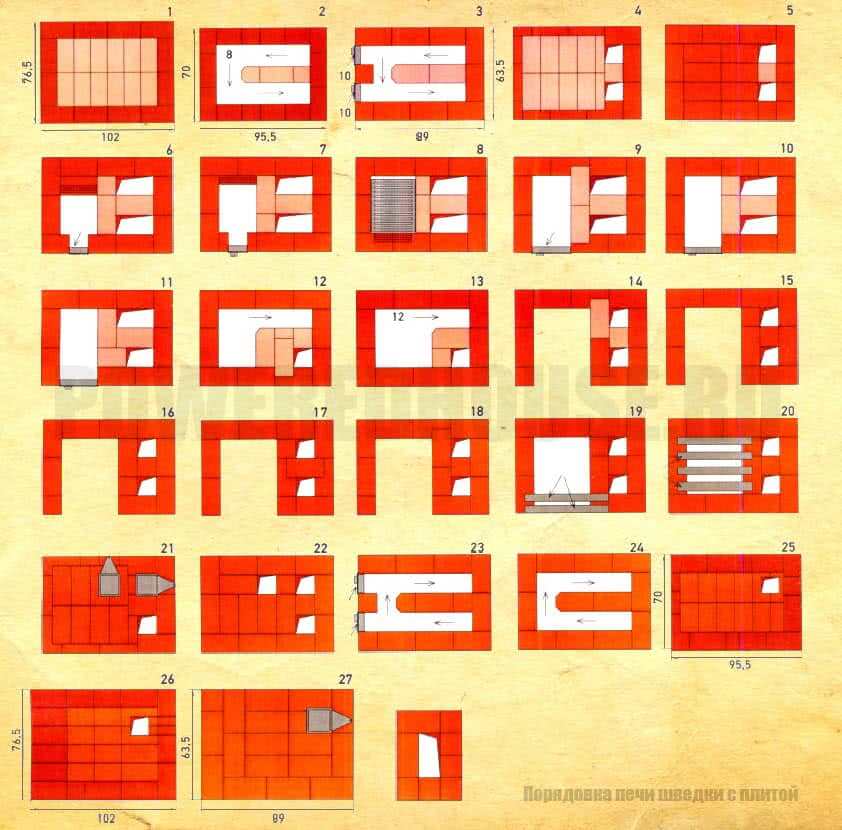 Для постройки шведской печи с духовкой и варочной плитой лучше всего воспользоваться порядовками и схемами, которые мы приводим ниже.