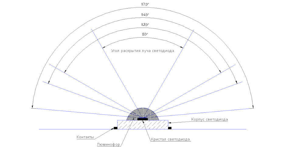 Эти же моменты применимы и к светодиоду с люминофором. Там угол излучения ограничен подложкой и углом наибольшей активности инициирующего излучения p-n перехода. Надо понимать, что на глаз точно определить эти углы невозможно – нужны специальные приборы. Но можно визуально сравнить два светодиода — у какого угол раскрыва больше.
