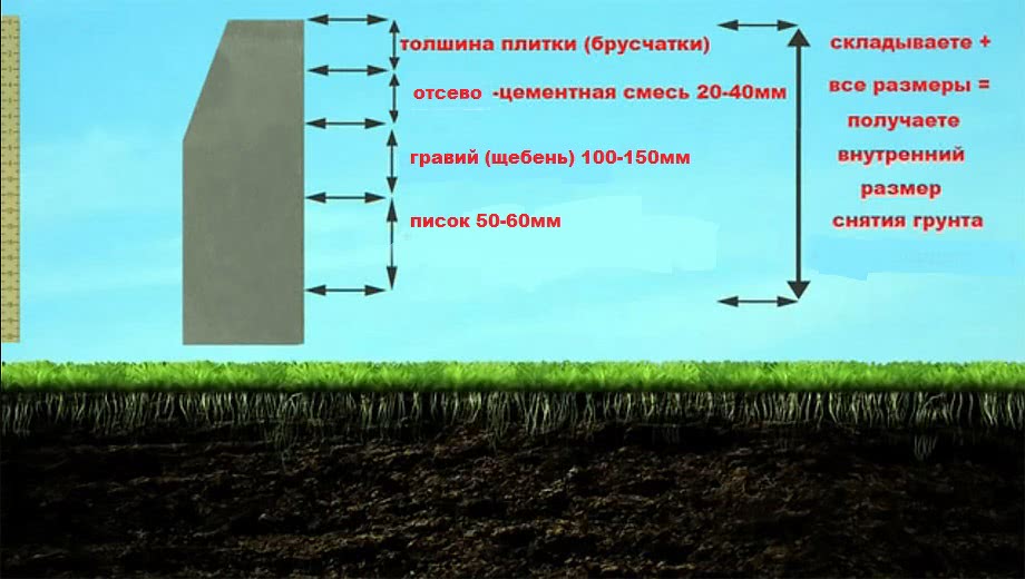 Когда эти все данные у нас есть, мы суммируем конструктив: толщина песчаной подушки, плюс толщина щебневой основы, плюс толщина гарцовочной подстилки, плюс толщина плитки. Толщину плитки можно брать за минусом одного сантиметра. Этот сантиметр компенсируется при трамбовании уложенной плитки виброплитой. Нужно учитывать, что на территории толщина плитки может быть разная — в зависимости от технологического назначения.