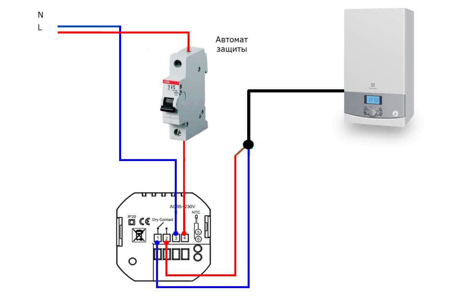 Термин “сухой контакт” говорит, что в любом состоянии напряжение на этих зажимах отсутствует. То есть, подача питания 220V на колодки L и N термостата, никак не будет связана с сухими контактами, и напряжение туда никогда не попадет.
