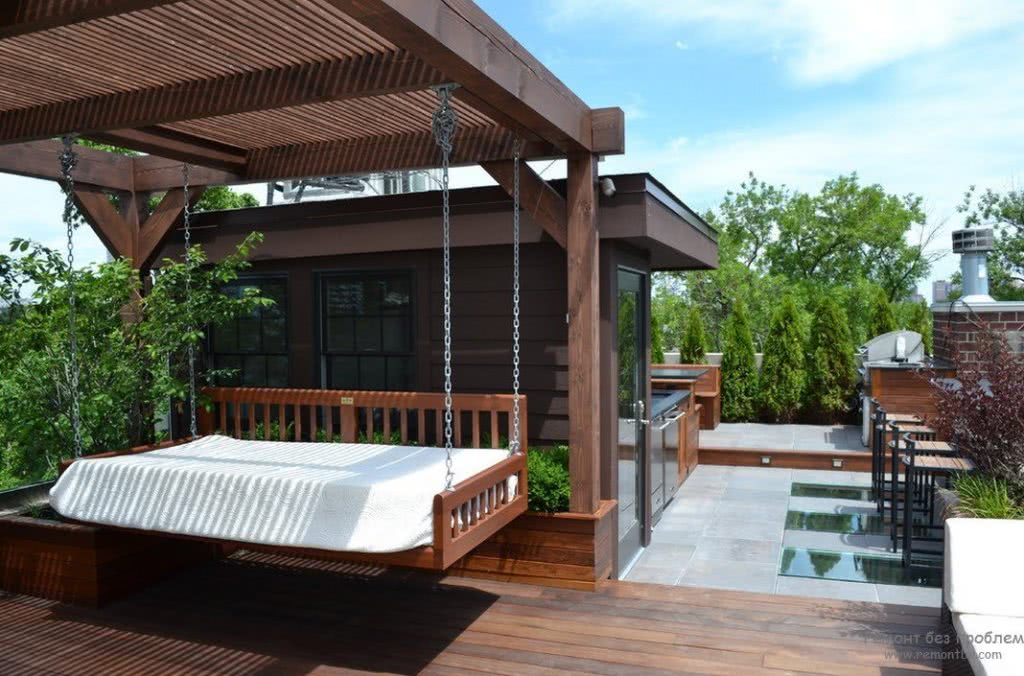 Диваны-качели также являются популярным оформлением летней террасы в деревянном доме. Это комфортное место для релакса взрослым и радость детям. На сегодняшний день существует множество разных конструкций для качелей. Это и маленькие деревянные, романтичные на веревках, детские на цепях, целые кровати, парящие в воздухе, одноместные, вместительные многоместные, раскладные и съемные. Материал и цвет выбирается любой. Одновременно востребованы и деревянные, и металлические варианты, с мягкой спинкой или сидением. Главное, чтобы дизайн гармонировал с уже созданным стилем террасы.
