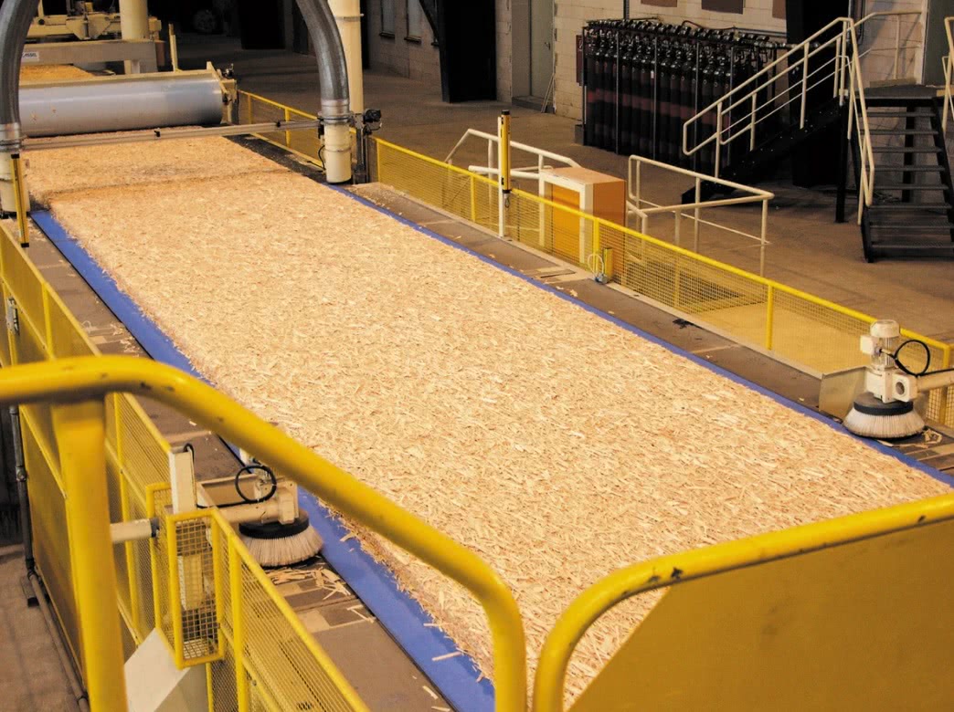 Для производства ОСБ используется древесная щепа. Сырье предварительно выкладывают несколькими слоями, затем под высоким давлением прессуют. При этом каждый слой предварительно пропитывают специальным клеевым составом.