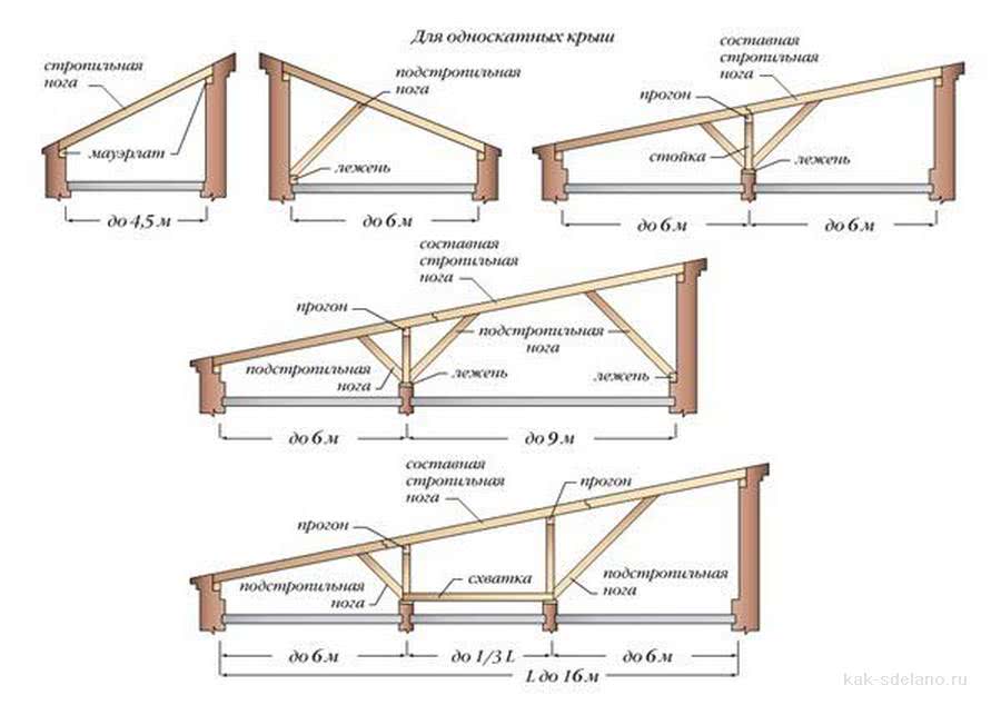 Монтаж односкатной стропильной конструкции производится на мауэрлат.