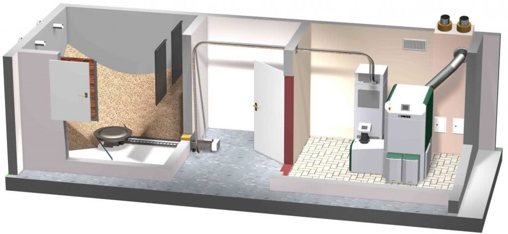 Туда наполняется топливо в таком количестве, чтобы хватило на целый отопительный сезон. С этого склада организуется подача с помощью шнекового или пневматического привода прямо в котел отопления.