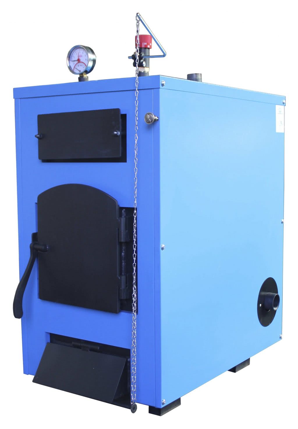 Простая и надежная конструкция, рассчитанная на отопление небольшого дома или дачи, площадью до 100 кв.м. Работает на дровах и угле, предусмотрена установка ТЭНа, мощностью 6 кВт. Рекомендуемое давление в системе – до 3 атмосфер. Конструкция теплообменника упрощает доступ при чистке. КПД достигает 80%, приближаясь к показателям котлов на дизельном топливе.