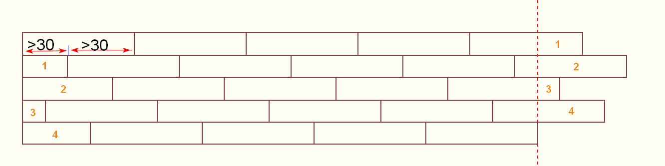 следующего ряда, обычно 30-40 см. Это означает, что смещение может быть любым, но не меньше 30 см. При укладке
