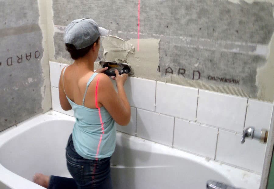 Первым делом со стен удаляется старое покрытие и то, что может отвалиться. Если есть жирные пятна, их выводят, или просто срубают часть штукатурки вместе с впитавшимся маслом. Стены простукивают деревянным молотком, по звуку определяя есть ли пустоты. Они возникают если штукатурка отслоилась, но еще не выдулась. Если на такой участок наклеить плитку, под ее весом все обвалится. Потому все такие места оббиваете сами.