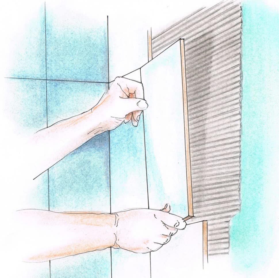 До того как клеить плитку, повторно производится замер высоты, которая делится на размер кафеля — при помощи плиткореза выполняется резка плитки, чтобы обрезанные части можно было использовать внизу, то есть в местах, где они менее заметны.Внимание! При работе с болгаркой или плиткорезом не забудьте надеть защитные очки, маску и перчатки!