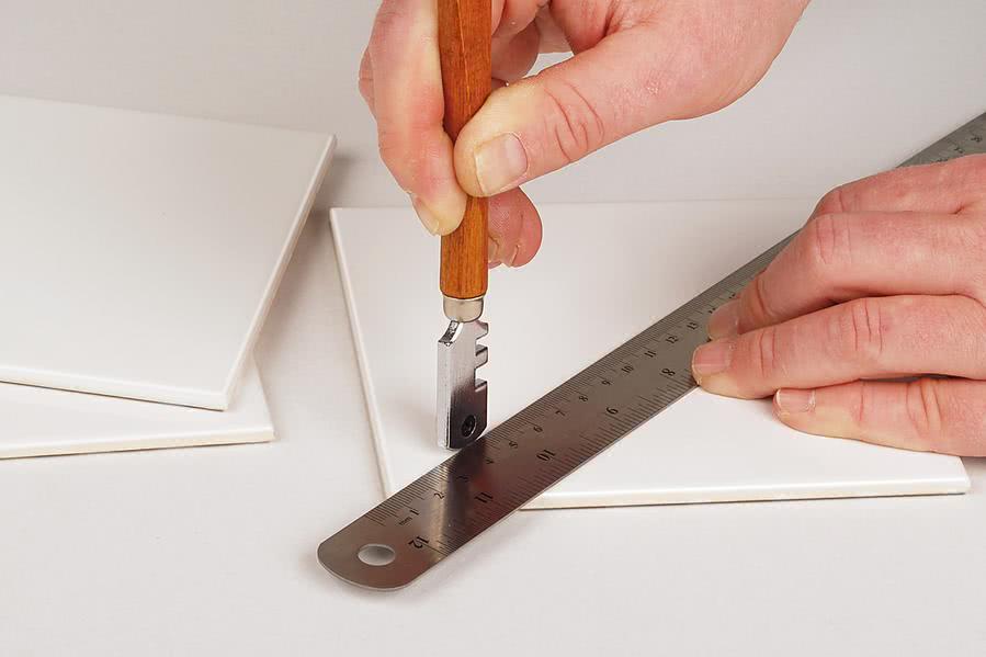 Сначала по линейке карандашом прочерчивают линию надреза, затем берут стеклорез или плиткорез, прикладывают к намеченной линии линейку (брусок) и по ней процарапывают плитку. На инструмент нажимают с силой, чтобы надрезать не только верхний, но и более глубокие слои.