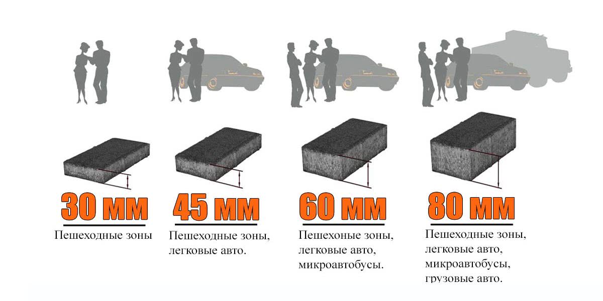 Важно определить, какой должна быть толщина плитки, которую вы собираетесь укладывать на участке. Пешеходные дорожки, как правило, покрываются плиткой толщиной 40 миллиметров, а для укладки автомобильной стоянки нужна плитка значительно прочнее – от 60 до 80 миллиметров