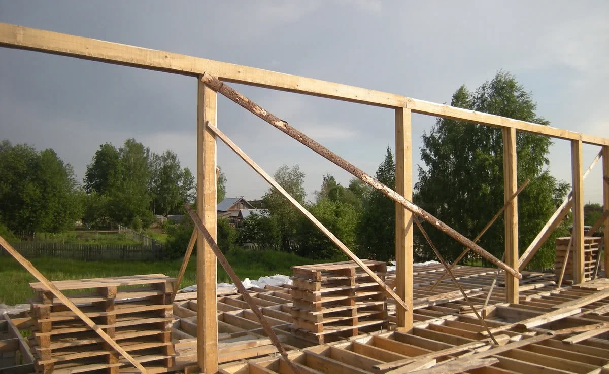 Для большей прочности можно укрепить крайние балки подстропильными ногами. Для этого к опорным столбам со стороны стены на уровне окончания столбов противоположной стороны крепится брус под углом 45 градусов, который будет удерживать стропила и кровлю зимой, при избыточном весе снега.