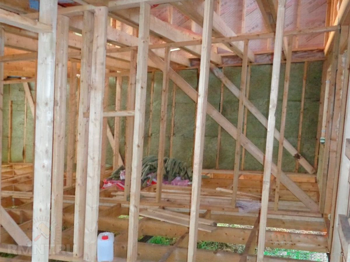 Подрезайте на толщину укосины минеральный утеплитель, чтобы вдоль краев не образовывались воздушные мешки и не страдало качество утепления в каркасном доме.